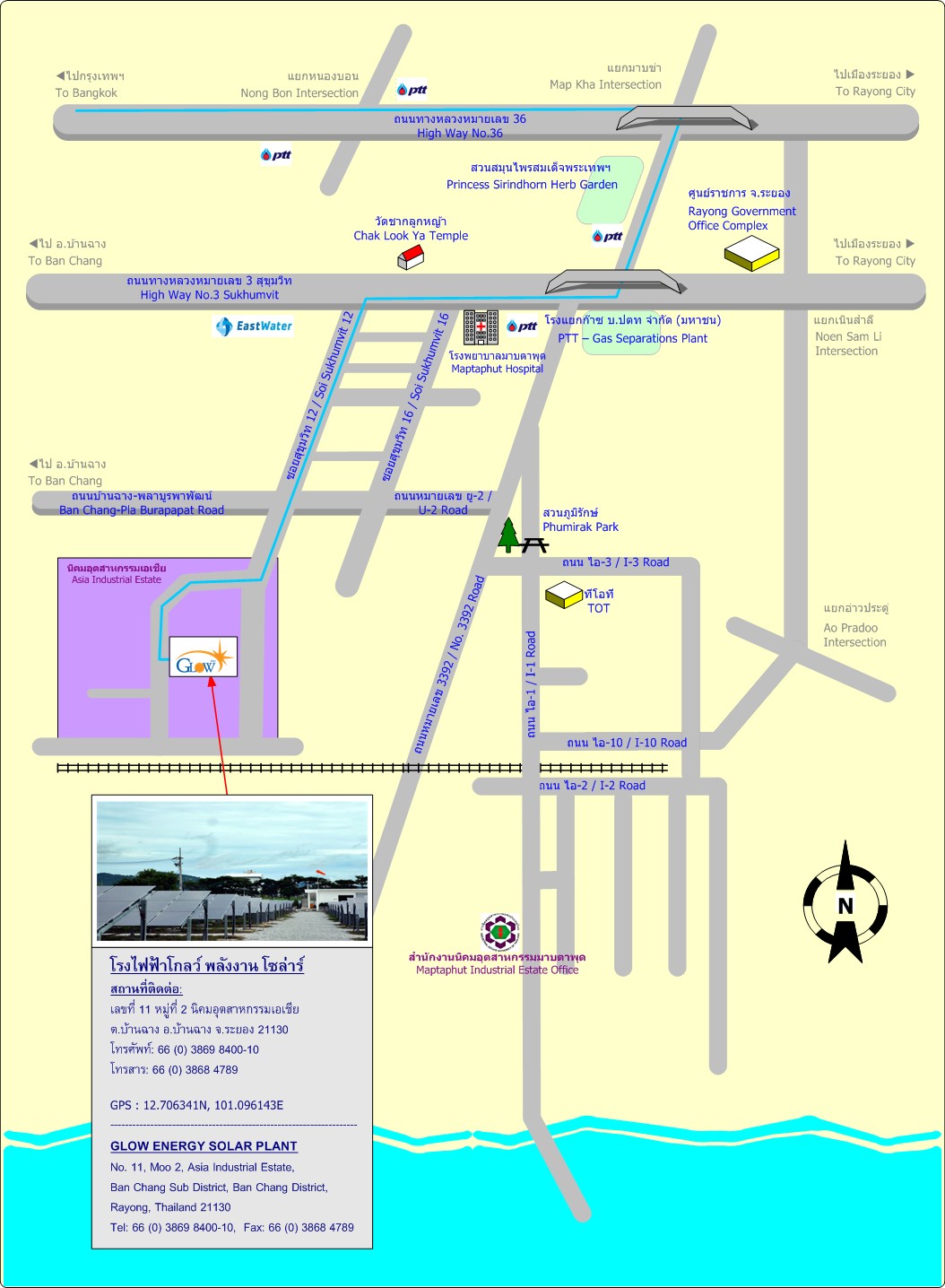Glow Energy Solar Power Plant was developed by Glow Energy Public Co., Ltd., to support Thailand's target of increasing renewable energy production and it commenced commercial operation on 1 August 2012 selling the produced energy to PEA under Very Small Power Producer (VSPP) program. This plant, with installed capacity of 1.55 MW, is Glow’s first renewable electricity power plant and it shows the Group’s ambition to grow its renewable energy business. 31,000 thin film PV modules, which are designed and manufactured by Bangkok Solar Co., Ltd., are installed on over 50,000 square meters at Asia Industrial Estate, Rayong province. The nominal power of each PV module is 50 Watt and they are connected to the grid via 6 @ 250 kW inverters. Annual generation is expected to be ca. 2,000,000 kWh, which is enough to supply annual consumption of approximately 1,400 typical Thai households. Approximately 1,155,000 kg of CO2-emissions is avoided each year of operation, compared to Thai baseline for CO2 emissions.